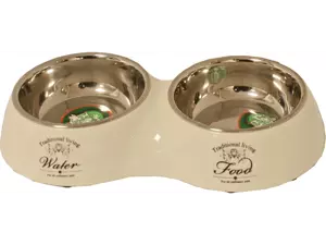 Beige dubbele honden eet- of drinkbak met de tekst Water of Food. Deze voerbak is gemaakt van plastic met een RVS eet- of drinkbak. De voerbak is voorzien van een anti-slip rand. Verkrijgbaar in verschillende maten.