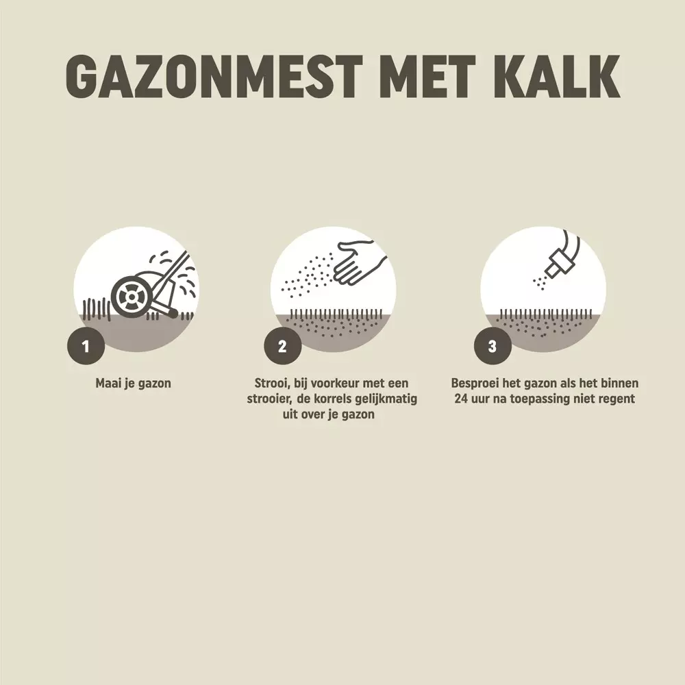 Maai je gazon. Strooi, bij voorkeur met een strooier, de korrels gelijkmatig uit over je gazon. Besproei het gazon als het binnen 24 uur na toepassing niet regent.Dosering: