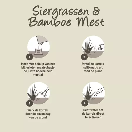 Meet met behulp van het bijgesloten maatschepje de juiste hoeveelheid mest af. Strooi de korrels gelijkmatig uit rond de plant. Werk de korrels door de bovenlaag van de grond. Geef water om de korrels direct te activeren.Dosering: